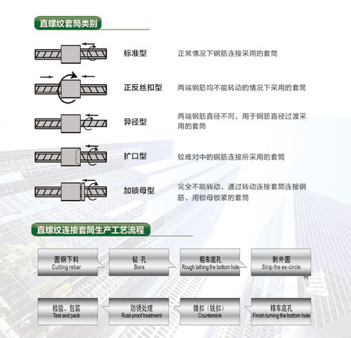 直螺纹连接套筒适用于建筑工程中钢筋机械连接,主要连接Φ12-Φ50mm的HRB335、HRB400及HRB500普通热轧带肋钢筋。