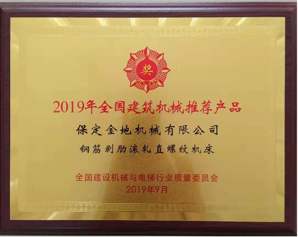 25日晚上全国建设机械与电梯行业质量委员会在无锡太湖国际博览中心旁君来世尊酒店举办了“2019年建机推荐颁奖典礼暨中外客商迎宾晚宴”。我公司的主营产品钢筋剥肋滚轧直螺纹机床喜提“2019年全国建筑机械推荐产品”,“金地”品牌又一次用高品质产品获得大家的认可!